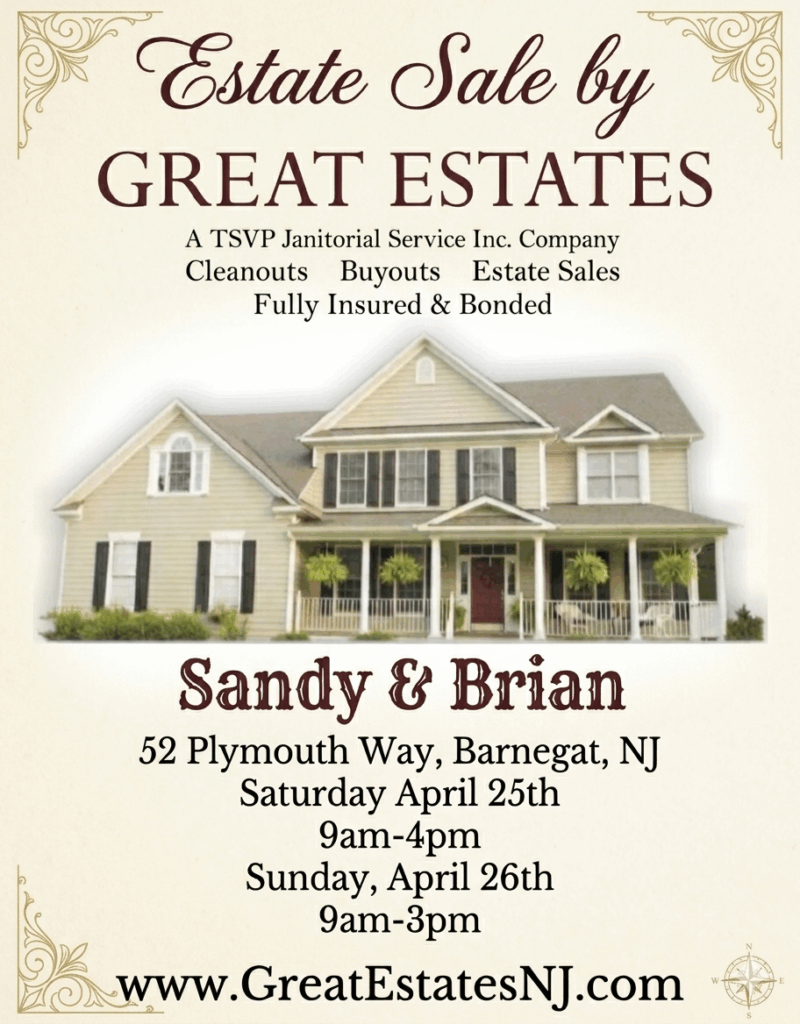 Welcome to Great Estates & TSVP Janitorial Service Inc. based in Jackson, NJ. For 40 years, we have been providing professional ESTATE SALES and CLEANOUTS in the New Jersey Area. Other than Estate Sales and Cleanouts, we also provide downsizing and estate buyout services. Call us today at 732-740-3077 to discuss what options are available. Click here to see areas we serve.
